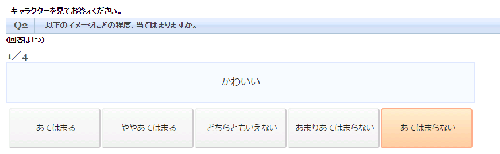 他のアンケートサイトだと、こういう「あてはまる/あてはまらない」を一つだけ選ぶような設問の場合、十数行分~多いときは50行分もの設問の表が1ページにドドーンと表示されて、それを解答していく場合が多いので、自分のコンディションがあまりよくない時にアンケート参加していると、うっかり一行見落としたりしてしまったりして、「あーようやく終わったー回答送信~→【エラーメッセージ:ご回答していない設問があります】→あれ? どこじゃー!」というトラブルもしばしば(大汗)
